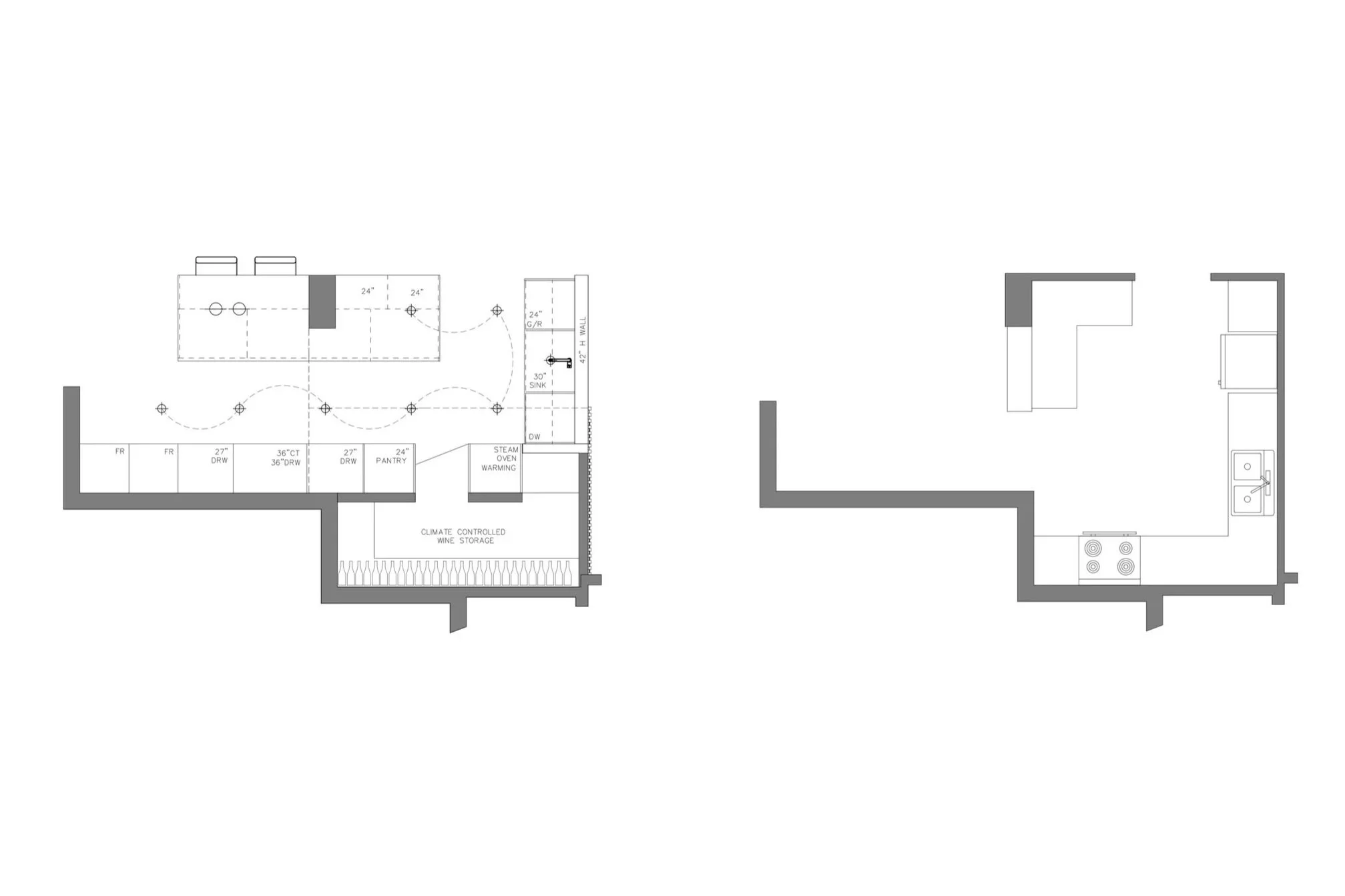 By relocating the dining area closer to the terrace, we were able to enlarge and square off the kitchen, transforming it into the true heart of the home. The new kitchen floor plan allowed for improved workflow, increased storage, and generous prep space—while also making room for a temperature-controlled wine cellar, a highly personal feature that reflects our clients’ passion for collecting and entertaining.