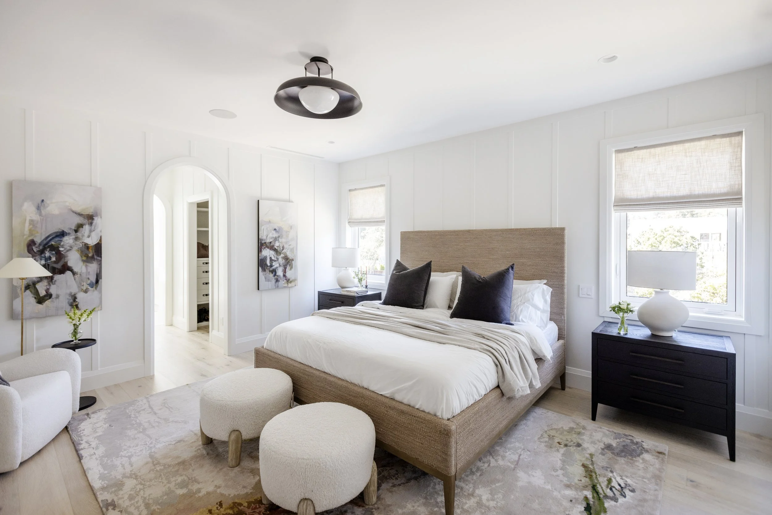 Custom millwork in soft, muted tones is paired with warm metal accents. Stone countertops and backsplashes add organic texture, while hardwood floors bring warmth and character. Bespoke lighting and refined hardware elevate the space with understated elegance.
