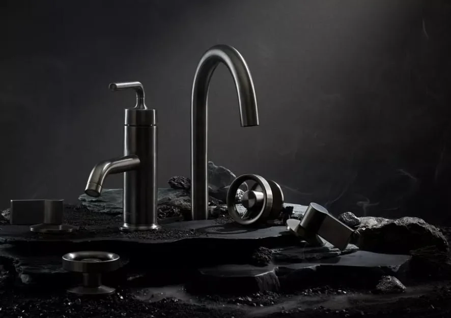 Kohler’s new Billet Faucet Collection—a stunning design with industrial roots, available in a beautiful new Graphite finish that bridges black and stainless.