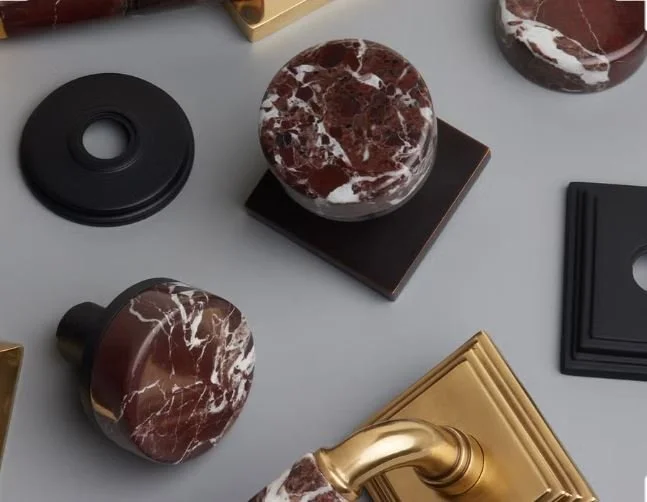 A luxurious tone, seen in the millwork and tile at Monogram, and in natural stone with Kallista's freestanding tub and Emtek's hardware, both crafted from Rosso Lavonto marble.