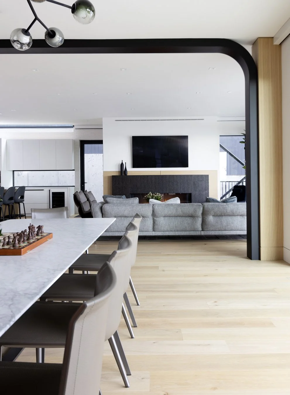 The kitchen and architectural elements are intentionally restrained—designed to integrate, not dominate.