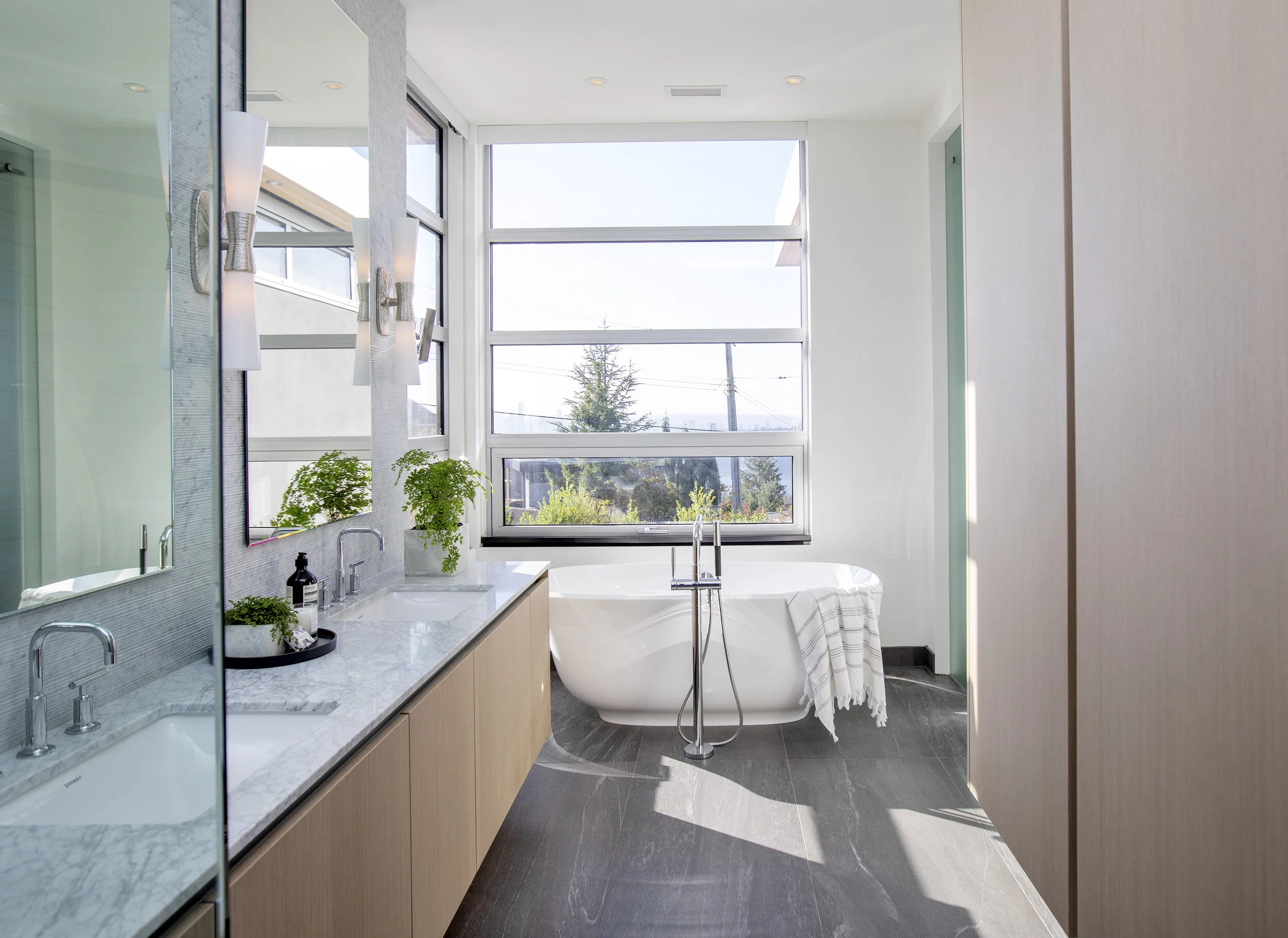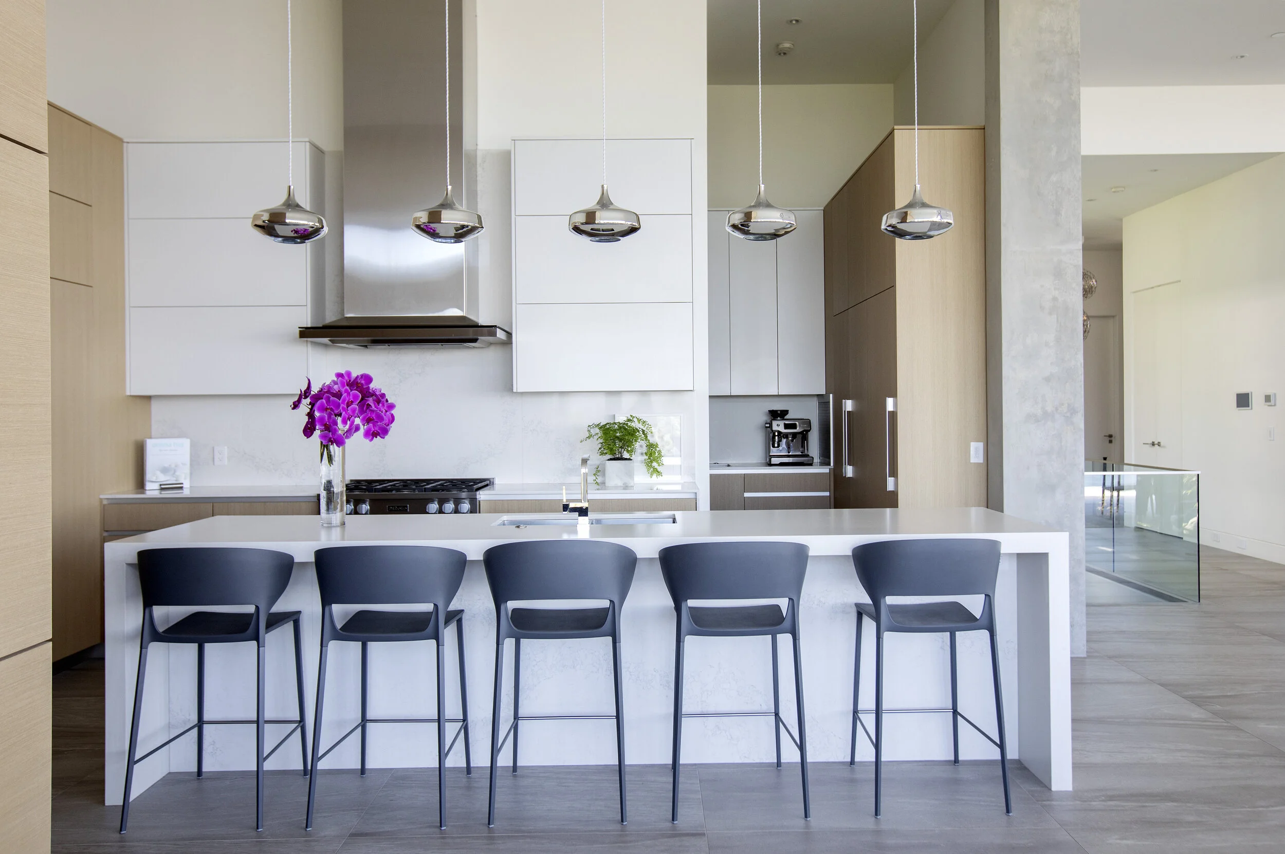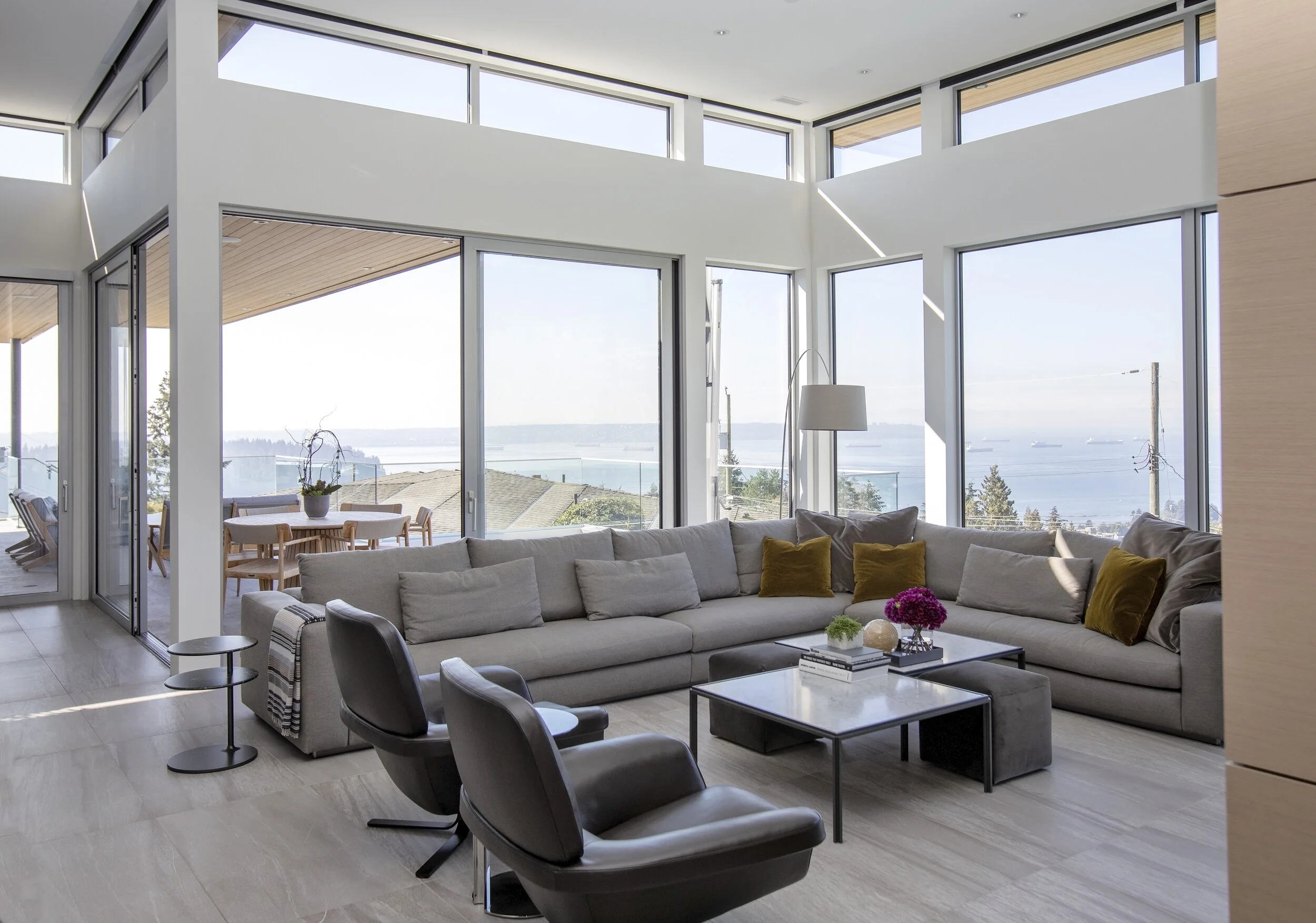 This new build was designed to feel like an urban loft with ceilings up to 14 feet high and huge windows over looking the city and ocean. The main floor has a chef style kitchen, dining and living rooms, master bedroom and fully equipped home office. The lower level has bedroom suites for the kids and guests, media room, bar and walks out onto a beautiful pool deck.